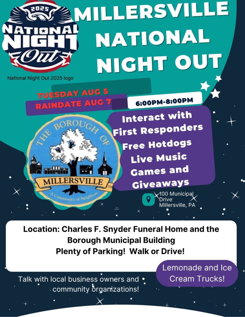 Millersville Borough is excited to host its second annual National Night Out on August 5, 2025! The event will be held from 6:00 to 8:00 PM in the large parking lot and grassy area behind Charles F Snyder Funeral Home on North George Street and the Borough Municipal Building parking lot- 100 Municipal Drive, Millersville PA. Rain date will be August 7, 2025.