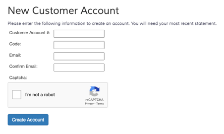 Fill in New Customer Account: enter your Account #, unique access Code and Email address, then click “Create Account”.