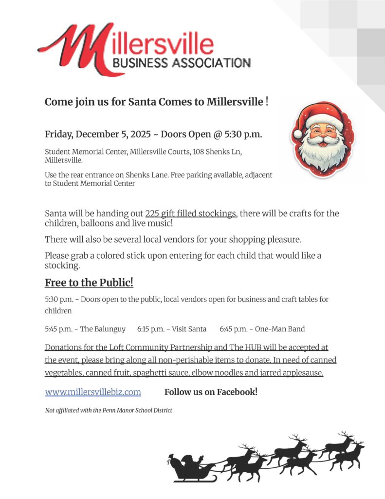 Join us with the Millersville Business Association to see Santa this year on Friday, December 5th at 5:30 p.m. at the Student Memorial Center, Millersville Courts, 108 Shenks Lane.